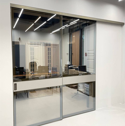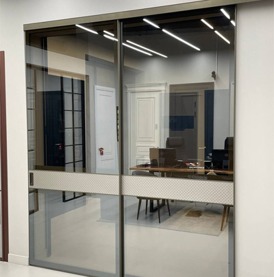Перегородки из закаленного стекла в алюминиевом обрамлении. Система может включать любое число секций, которые при открывании расходятся в разных направлениях или сдвигаются в одну сторону. Жёсткий, устойчивый к деформациям и в то же время лёгкий профиль позволяет использовать полотна разной высоты, ширины и даже формы. Каждая створка алюминиевой стеклянной перегородки включает металлическую раму, в которой закрепляются вставки ударостойкого стекла.