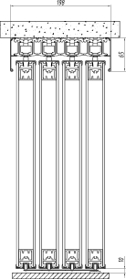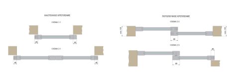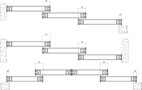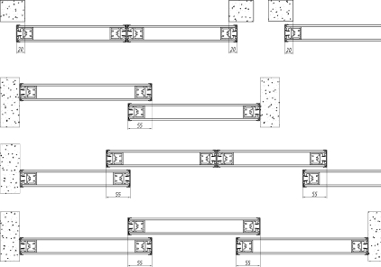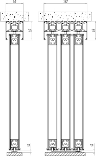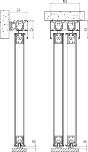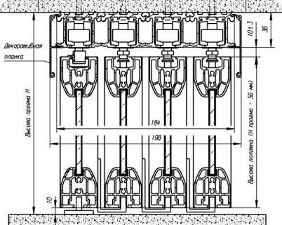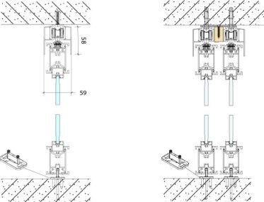 Створки объединяют с верхним направляющим профилем, имеющим одно- или многоканальное устройство. Фиксируют такие рельсы в потолке, в стене под ним, внутри прохода. Система может иметь 2, 3, 4 секции. Широкий выбор стеклянных вставок: прозрачные, матовые, рельефные.